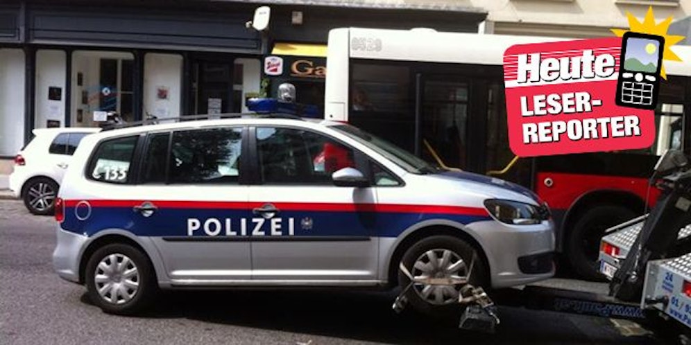 "Heute"-Leserreporter drückten dann auf den Auslöser, als der Einsatzwagen am Abschleppfahrzeug baumelte. Ob die Beamten den Weg zur Dienststelle zu Fuß antreten mussten, ist nicht bekannt.