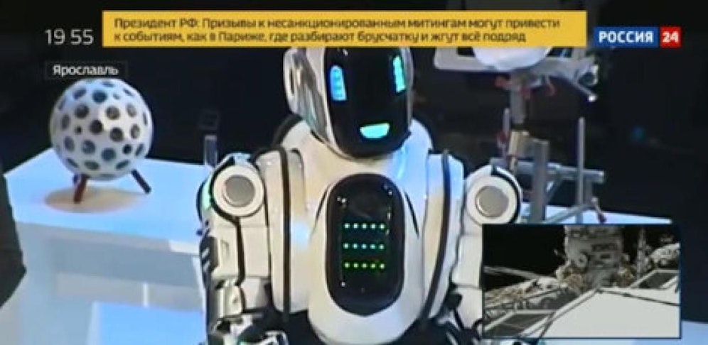 Der TV-Sender Russia 24 hat die humanoide Maschine Boris als modernen Roboter vorgestellt. Während einer Sendung mit Hunderten von Schülern war zu sehen, wie er herumlief, sprach und sogar tanzte.