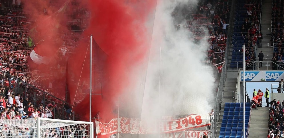 Vor dem Anpfiff des Duells zwischen Hoffenheim und Köln (6:0) präsentierten sich die Gäste-Fans von ihrer schlechtesten Seite, nebelten die Arena in Sinsheim mit Bengalen in rot-weißen Rauch ein.