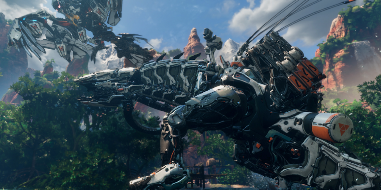 In der – wir können es nicht oft genug erwähnen – grafisch grandios aussehenden Spielwelt kommt es am Weg von Missionspunkt zu Missionspunkt auch immer wieder zu kleineren oder größeren Kämpfen, von einfachen Rotaugenwächtern bis hin zu gigantischen Donnerkiefern. Nahkampfangriffe bleiben uns dabei verwehrt, unsere Waffe der Wahl ist der Bogen. Für den sammeln wir im Spielverlauf aber immerhin neben den Standard-Pfeilen auch verschiedene Pfeile mit Feuer- oder Schockeffekten ein. Eine Auswahl an Fallen, Waffen und Pfeilen wie in den anderen "Horizon"-Abenteuern darf man sich aber nicht erwarten, es bleibt bei diesem Mini-Arsenal. Und auch die Kämpfe bieten nicht die vielen Freiheiten der bisherigen Titel.