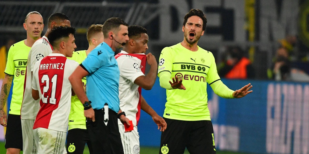 Diese Champions-League-Szene sorgt für Aufregung: Bei seiner Grätsche in der 29. Minute trifft Hummels Ajax-Angreifer Antony nicht einmal. Im Gegenteil: Der Brasilianer steht dem Deutschen sogar noch auf dem Fuß. Der VAR überprüft die Szene, hält aber an der Roten Karte von Schiedsrichter Oliver fest. Der BVB bleibt zunächst cool, Reus erzielt kurz vor der Pause per Elfmeter die verdiente Führung.