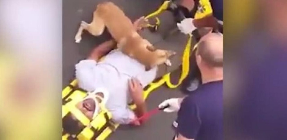 Ein Mann liegt auf einer Trage und muss ins Krankenhaus gebracht werden. Doch vorher spendet ihm sein Vierbeiner rührend Trost.