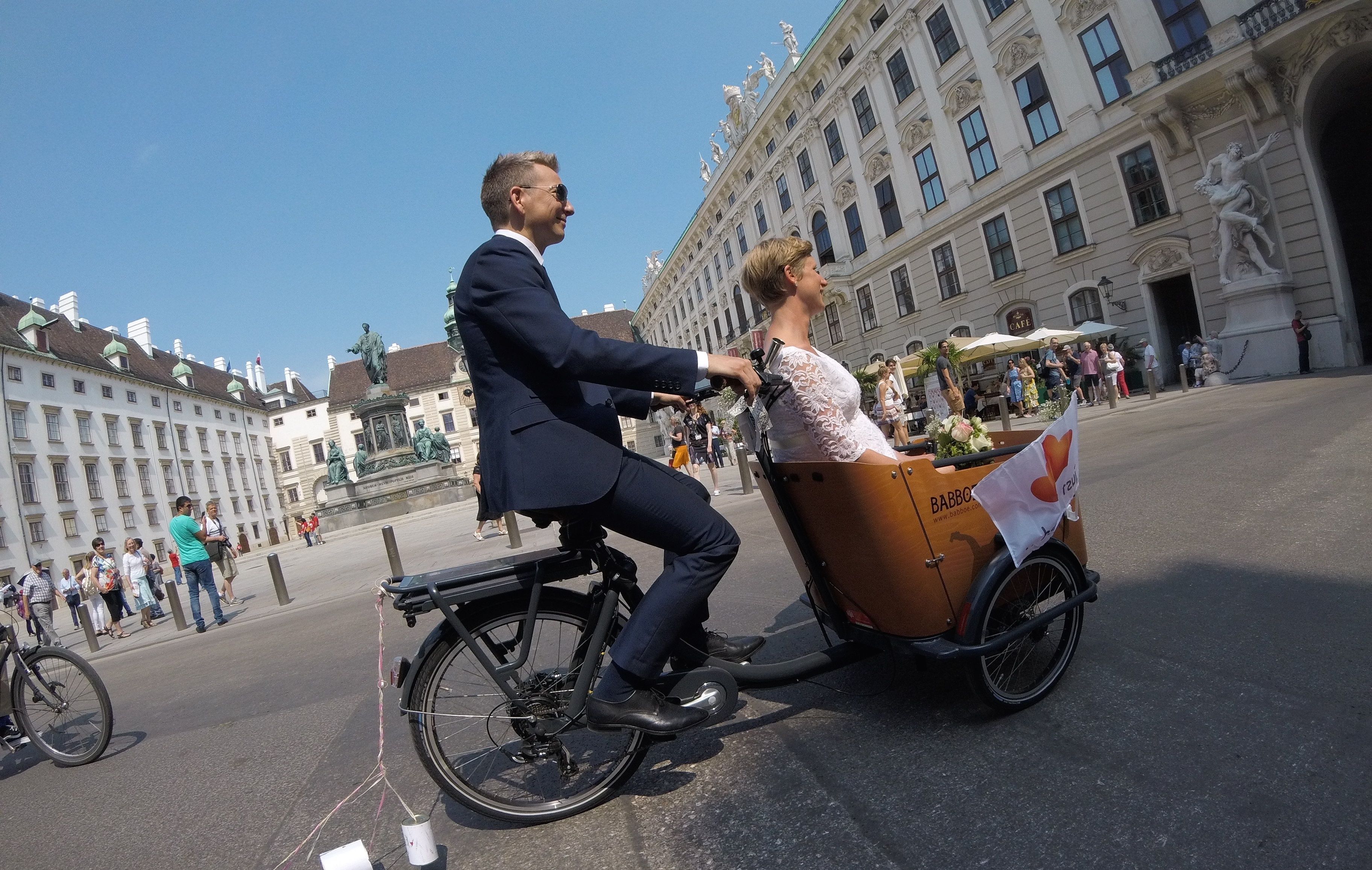 Leserreporter Thomas R. staunte: Auf seiner morgendlichen Joggingrunde kam ihm Samstag bei der Hofburg ein Lastenfahrrad mit Braut entgegen! Thomas und Peet aus Amsterdam ließen sich in der Wiener City trauen.
