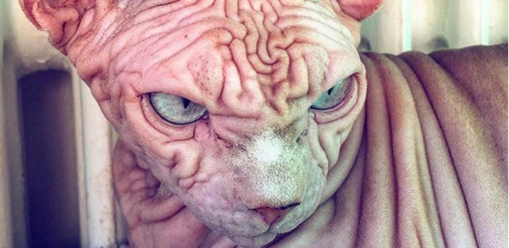 "Grumpy Cat" wär' blass vor Neid! Sphinx-Kater Xherdan (5) lebt mit zwei weiteren Artgenossen, einem Hund und Frauchen Sandra in der Schweiz – ihren zerknautschten und mürrischen Kater präsentiert die Besitzerin mit täglichen Schnappschüssen auf Instagram. Ihre Follower sind über den grimmigen Kater verzückt, die Samtpfote hat mittlerweile 5.470 Follower.