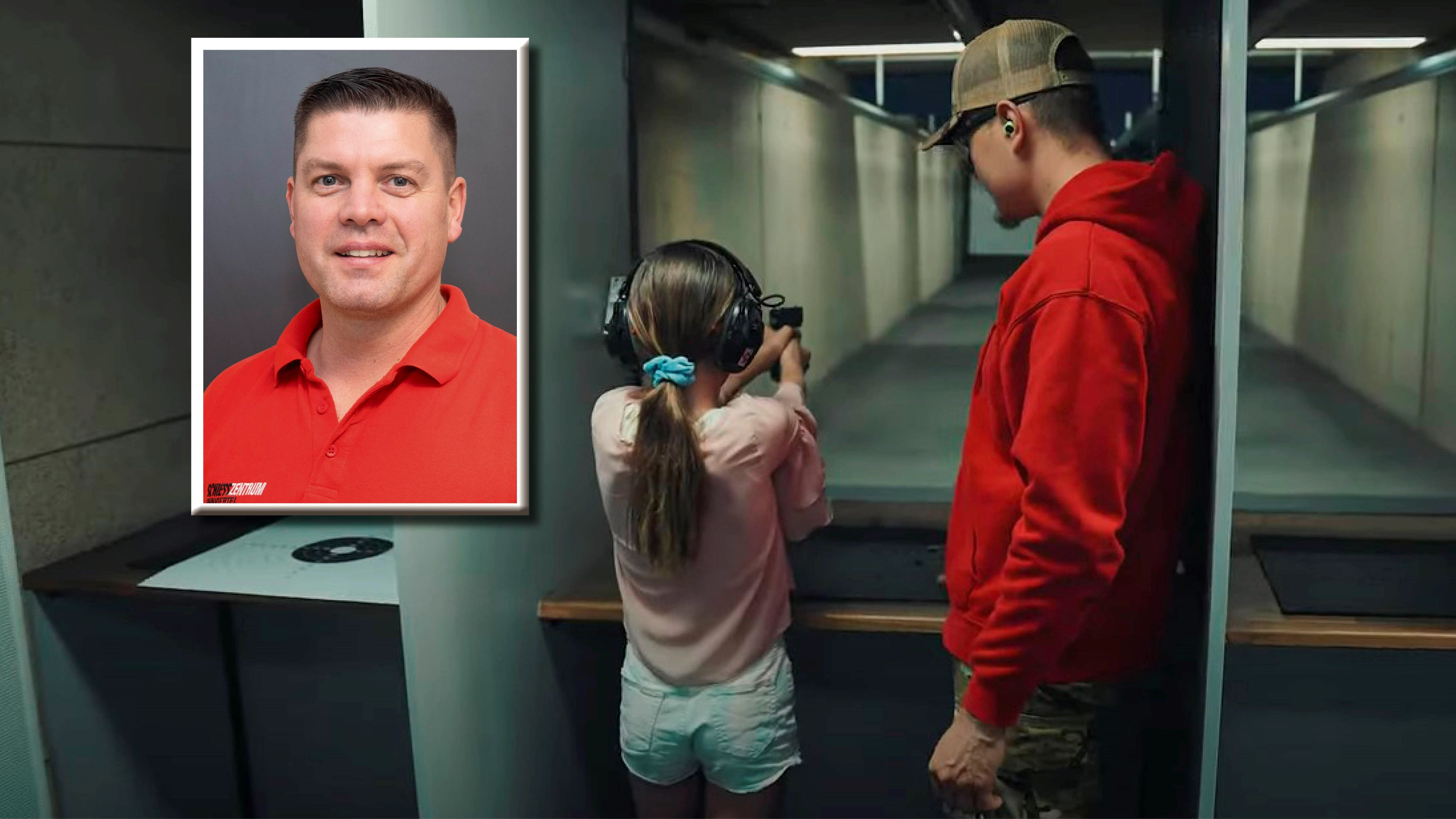 Ein YouTube-Video zeigt ein Kind mit kurzer Hose und rosa Shirt, das eine Pistole in der Hand hält. Mit einem Schießtrainer übt die Schülerin gerade an der Waffe. Daneben stehen die zwei Wörter "Jedes Alter".