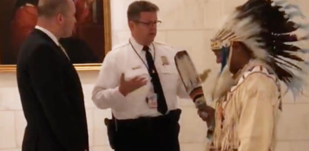 JoDe Goudy ist der Vorsitzende des Yakama-Stammes. Der Stamm lebt in einem Indianerreservat im Bundesstaat Washington. Goudy wollte in seiner Stammestracht am Obersten Gerichtshof in Washington D.C. eine Gerichtsverhandlung besuchen. Bei der Verhandlung ging es laut der Zeitung The Seattle Times um die Streitfrage, ob der Stamm dem Staat Treibstoffsteuern bezahlen muss.
