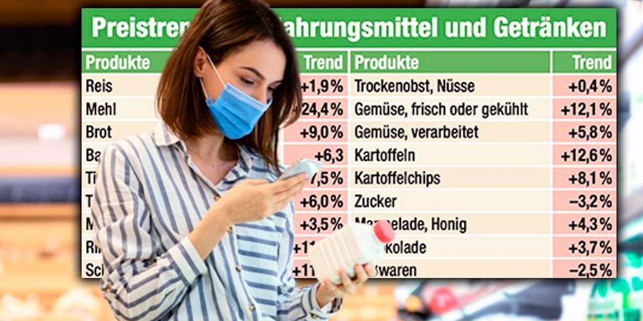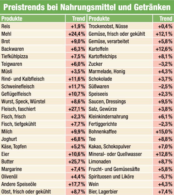 Nahrungsmittel und alkoholfreie Getränke verteuerten sich durchschnittlich um 8,4 Prozent und damit deutlich mehr als im März. Das zeigte sich insbesondere bei der Preisentwicklung von Fleisch (April: +10,7 Prozent). Die Preise für Brot und Getreideerzeugnisse stiegen um 8,2 Prozent, jene für Gemüse um 10,1 Prozent. Milch, Käse und Eier insgesamt kosteten um 6,9 Prozent mehr. Die Preise für Obst stiegen um 6,9 Prozent und für Öle und Fette um 18,2 Prozent (darunter Butter +25,7 Prozent).