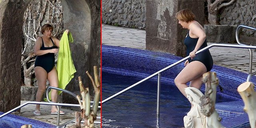 Auf Fotos ist zu sehen, wie die Kanzlerin im Badeanzug ein Bad im Freien nimmt. Im Gegensatz zur politischen Bühne handelt es sich dem Augenschein nach nicht um ein Haifischbecken.