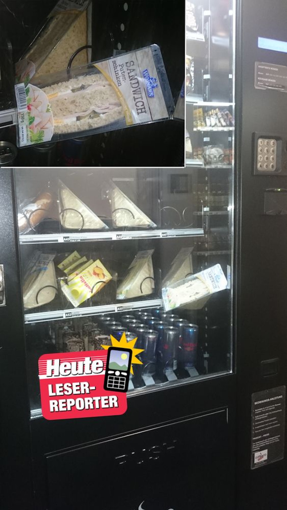 "Ich hatte solchen Hunger und habe mich schon seit Stunden auf meine kurze Pause gefreut", ließ uns Leserreporter Markus P. wissen. Doch als er sich dann bei einem Sandwichautomaten in seinem Firmengebäude einen Snack gönnen wollte, hatte der garstige Automat was dagegen.
