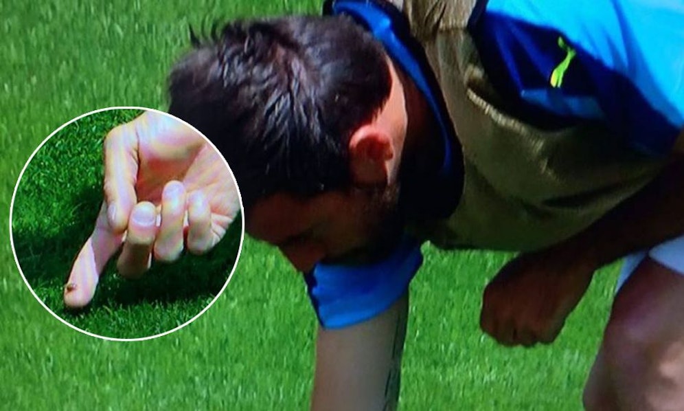 Tierliebe, oder besser Insektenliebe, auch am Rasen in Frankreich. Italiens Verteidiger Andrea Bazagli unterbrach am Samstag das Teamtraining seiner Mannschaft. Der Grund: Er hatte einen kleinen Marienkäfer in den Grashalmen entdeckt, den er vorsichtig mit seinen Fingern rettete und in Sicherheit brachte.