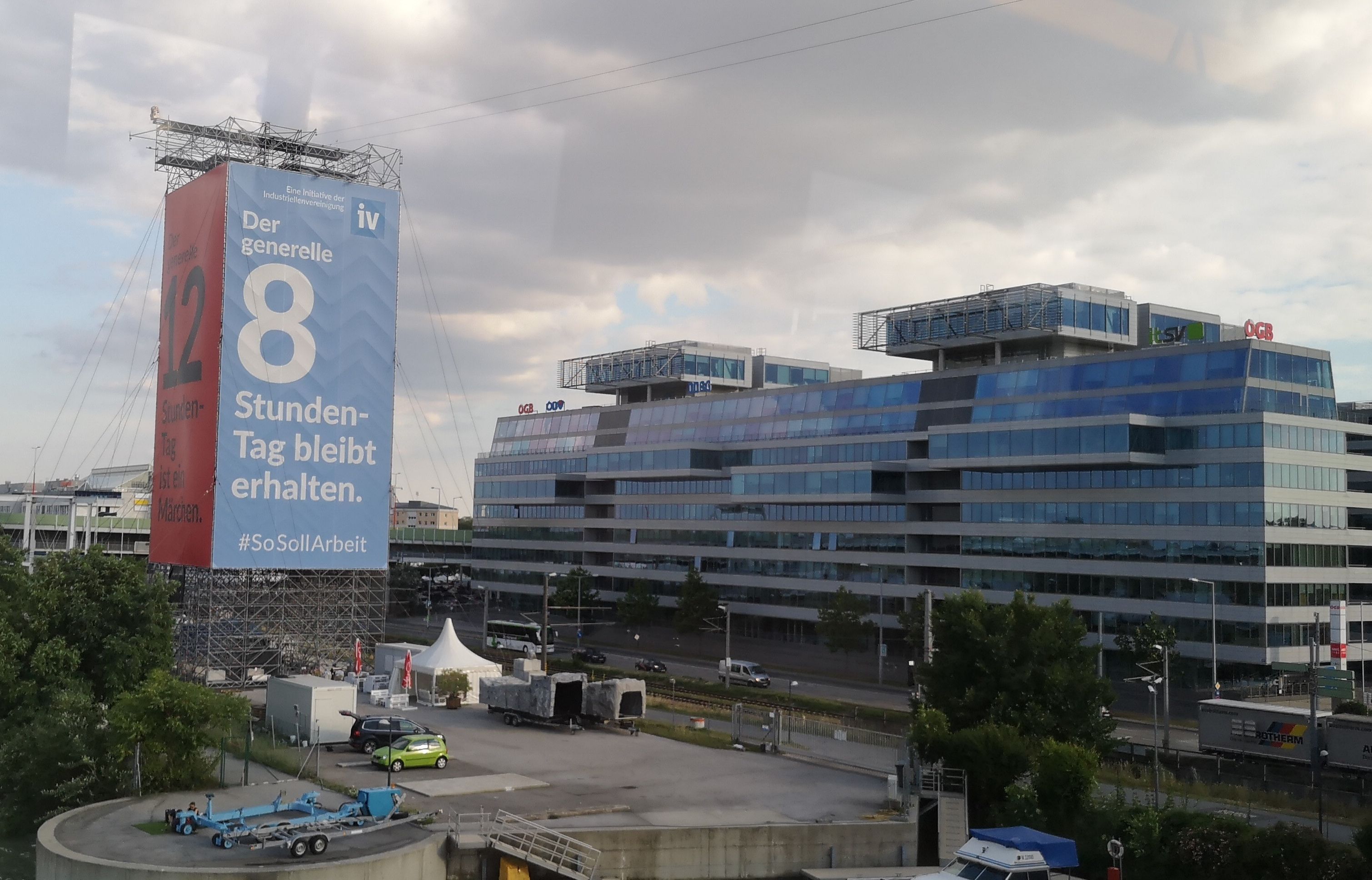 Die Gewerkschafter drohten wie berichtet bereits mit Streik. Und jetzt das! Die Industriellenvereinigung (IV) wirbt genau vor dem ÖGB-Verlagsgebäude in Wien mit einem gigantischen Plakatturm für eben jenes Arbeitszeitenmodell. Ob das Kriegsbeil bald wieder eingegraben wird? Derzeit sieht es nicht danach aus.
