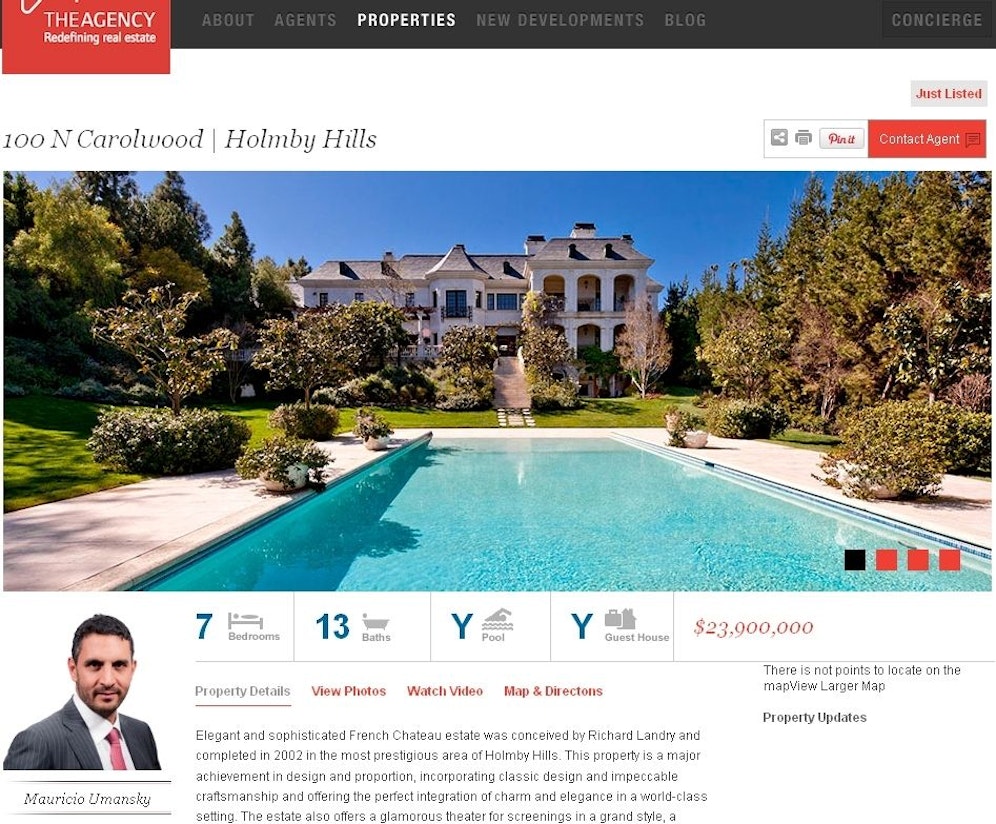 Auf den Internetseiten eines Immobilienmaklers wurde am Mittwoch das "französische Schloss" im Stadtteil Holmby Hills für 23,9 Millionen Dollar (18 Millionen Euro) angepriesen. Die 2002 erbaute Villa hat demnach sieben Schlafzimmer, 13 Badezimmer, einen "prächtigen Weinkeller", ein "glamouröses" Kino, einen Spa mit Fitnessraum und einen Pool - insgesamt stehen 1.580 Quadratmeter Wohnraum plus Gärten zur Verfügung.