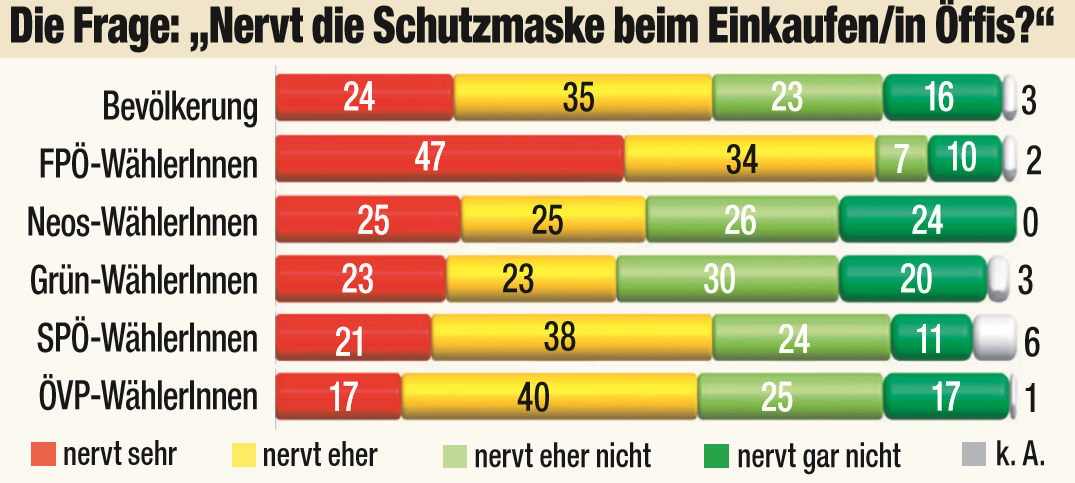 Ganz besonders regt die neue Maskenpflicht übrigens Blau-Wähler auf: Deutlichen 81 Prozent (!) von ihnen geht die Maskenpflicht auf den sprichwörtlichen Senkel. Am wenigstens genervt sind Grün- und Neos-Wähler.
