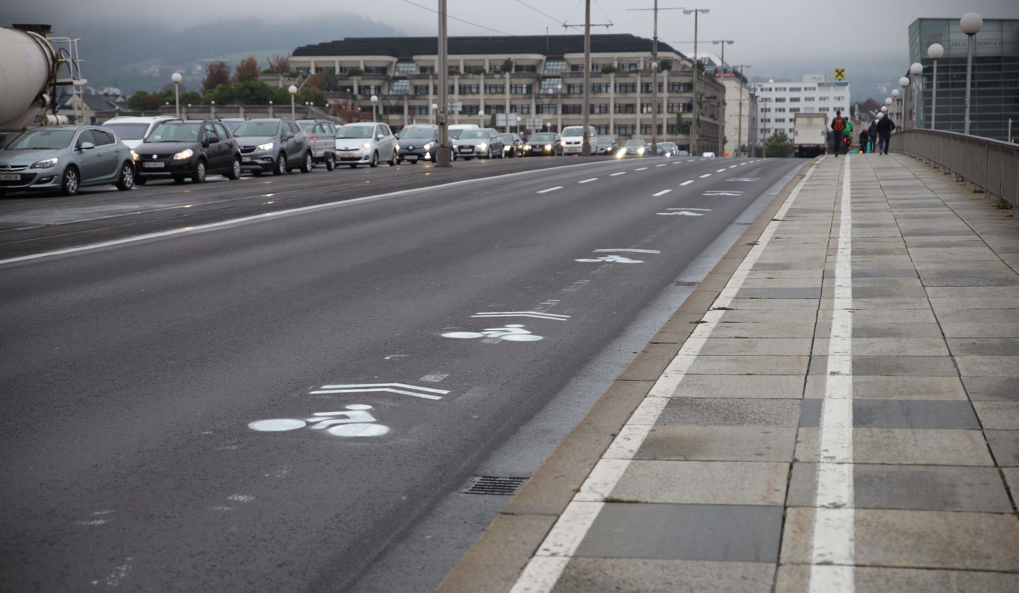Es war eine Nacht- und Nebel-Aktion von Sonntag auf Montag. Aktivisten haben auf der Nibelungenbrücke (in Richtung Urfahr) Radler-Piktogramme aufgemalt. Die sind haarscharf die selben, die die Stadt am Ende der Brücke (in Urfahr) aufgemalt hatte.