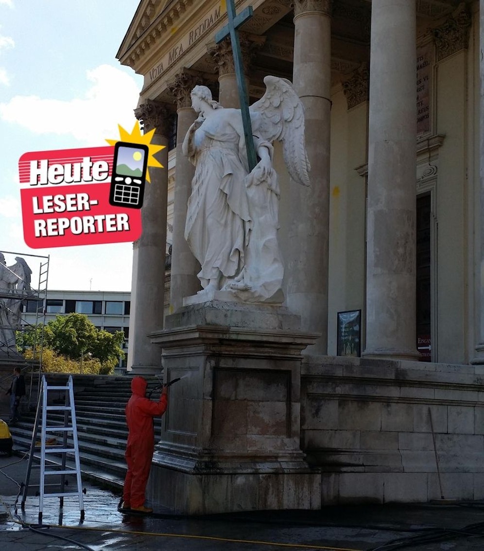 Nach den schweren Schäden, die Vandalen an der Karlskirche verursacht haben, laufen die Reinigungsarbeiten auf Hochtouren. Mit Hochdruckreiniger wird versucht die Farbe von der Kirche abzuwaschen.