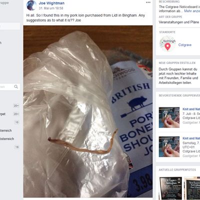 Diesen Schreckmoment wird der Brite Joe Wightman so schnell nicht vergessen: In einer bei Lidl gekauften Schweineschulter entdeckte er ein längliches Objekt, auf den ersten Blick sah es wie ein Bandwurm aus.