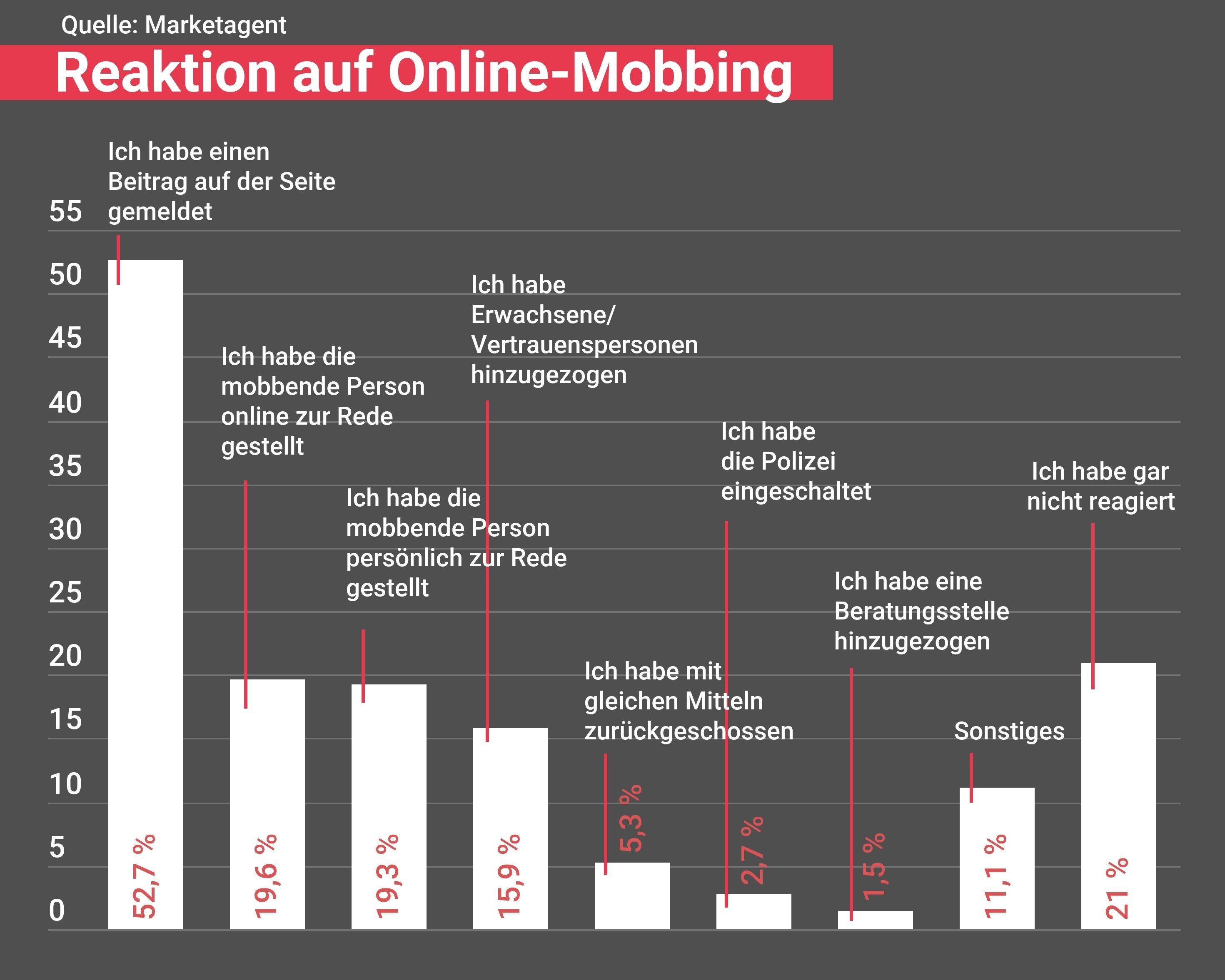 Frauen macht Mobbing im Internet betroffener als Männern. Während weibliche Befragte zu 77,8 % sagten, dass ihnen Anfeindungen "sehr" oder "eher nahe" gehen, waren es bei den männlichen "nur" 59,5 %. Die Reaktionen auf Online-Mobbing sind vielfältig: die meisten meldeten den betreffenden Beitrag (52,7 %), andere Maßnahmen waren außerdem das zur Rede stellen der mobbenden Person (online oder persönlich) sowie das Hinzuziehen einer Vertrauensperson.
