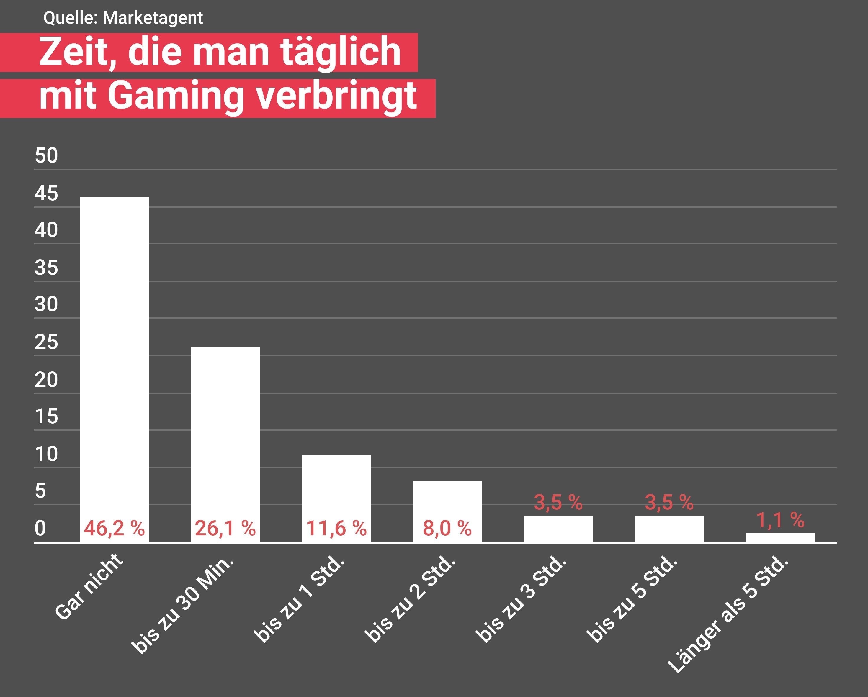 Etwas mehr als die Hälfte der Befragten spielt täglich am Computer oder der Konsole, ausgenommen Games auf dem Handy. Vielspieler sind allerdings eine Minderheit, denn während noch 26,1 % bis zu einer halben Stunde täglich mit Games verbringen, sind es bei bis zu drei bzw. fünf Stunden jeweils nur noch 3,5 %. Lediglich 1,1 % der Jugendlichen spielen exzessiv und somit mehr als fünf Stunden pro Tag.