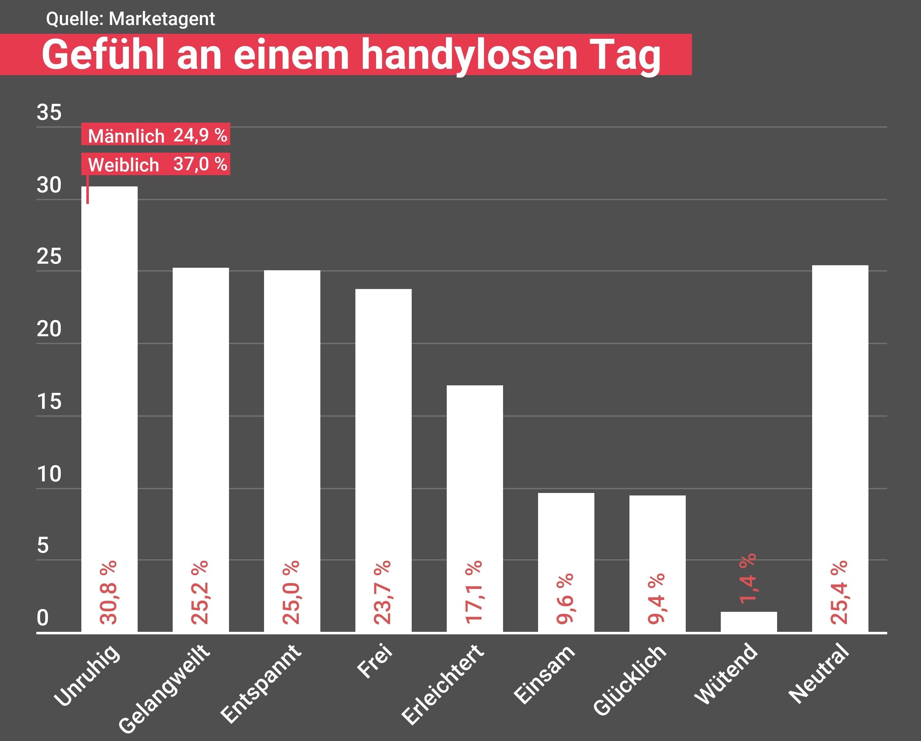 Obwohl 74,3 % der jungen Menschen sich mindestens gelegentliche eine Auszeit von ihrem Handy wünschen, divergieren die Gefühle an einem Tag ohne Smartphone. 30,8 % fühlen sich unruhig, bei 25,2 % kommt Langeweile auf. Bei 25 % stellt sich Entspannung ein, auch Erleichterung (17,1 %) wird genannt.