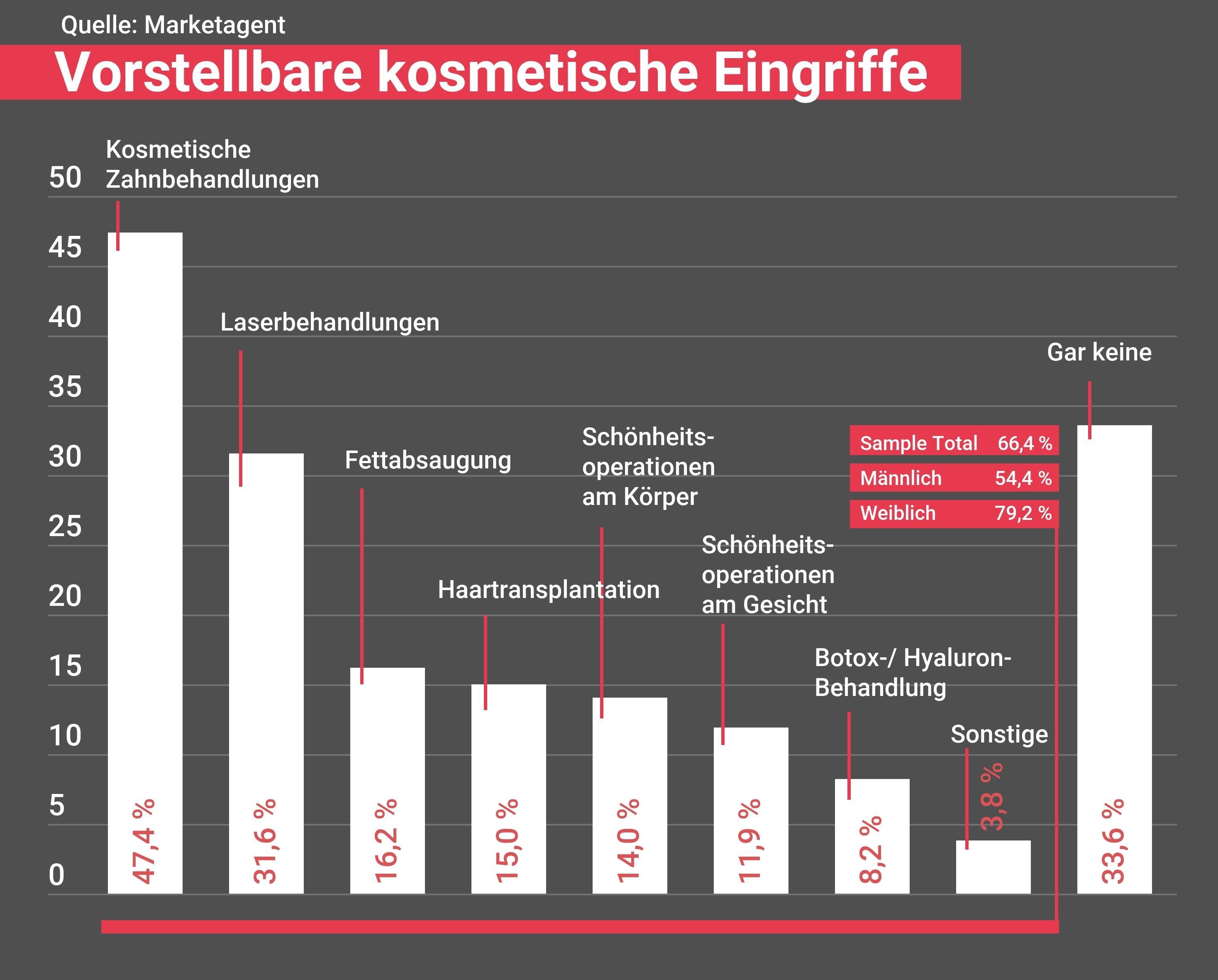 Knapp über ein Drittel der Befragten kann sich grundsätzlich keine kosmetischen Eingriffe vorstellen. Fast die Hälfte hätte kein Problem mit optischen Zahnbehandlungen (47,4 %), danach folgen Laserbehandlungen (31,6 %), Fettabsaugungen (16,2 %) und – kein Scherz – Haartransplantationen (15 %). Auffallend: 54,4 % der männlichen Befragten kann sich eine Behandlung vorstellen, während fast 80 % der Frauen "etwas machen" lassen könnten.