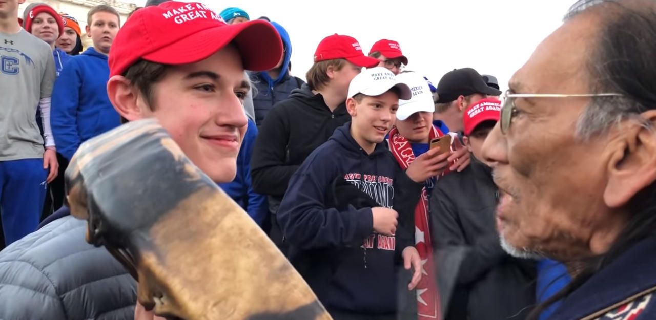 Zu sehen ist, wie mehrere Dutzend Burschen – viele von ihnen tragen die "Make Amerika Great Again"-Mützen von Trump-Fans – den Stammesältesten Nathan Philips umschwärmen, seinen Gesang nachäffen und verspotten. Einer der Burschen stellt sich mit breitem Grinsen direkt vor Philips hin.