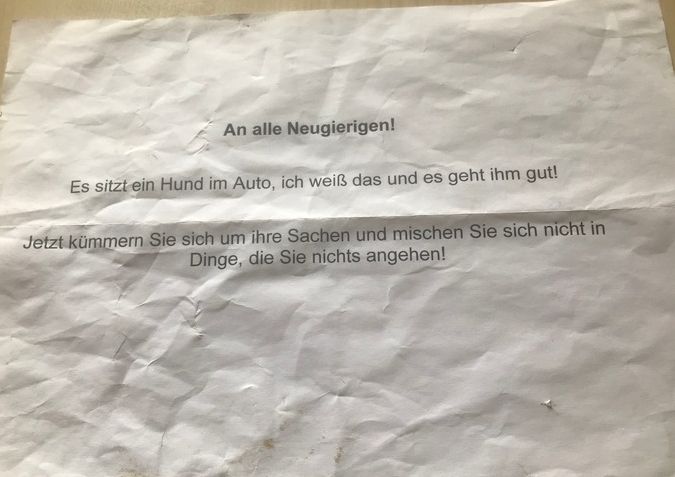 "An alle Neugierigen! Es sitzt ein Hund im Auto, ich weiß das und es geht ihm gut! Jetzt kümmern Sie sich um ihre Sachen und mischen Sie sich nicht in Dinge, die Sie nichts angehen!", stand auf einem Zettel auf dem Armaturenbrett.