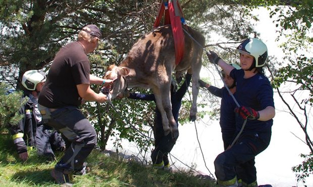 Eine junge Kuh ging am Dienstagmittag bei Haiming/Schlierenzau in den Inn baden. Das Tier stürzte über eine Böschung und musste von der Feuerwehr mit einem Kran aus ihrer misslichen Lage befreit werden.