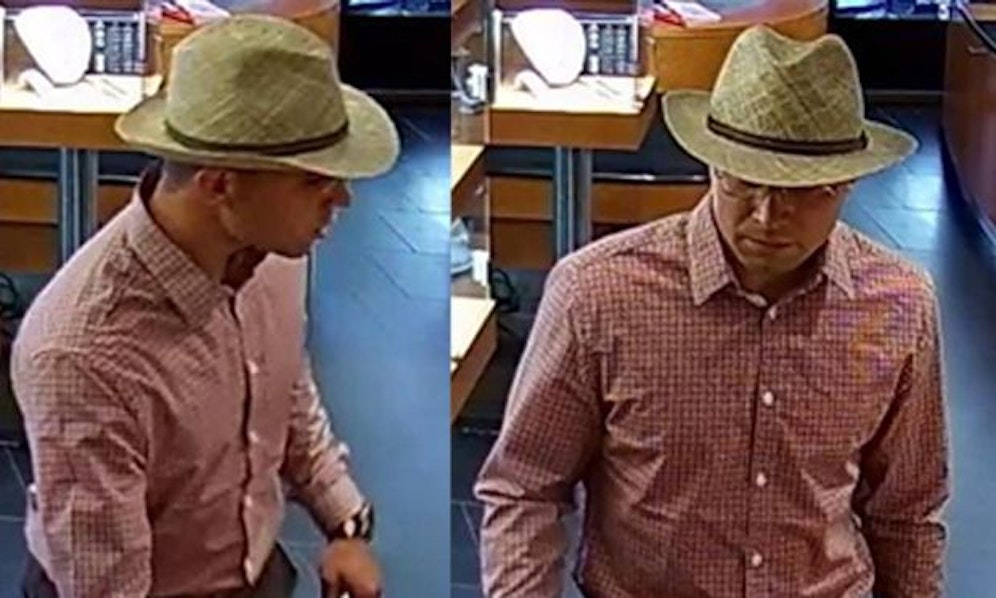 männlich ca. 30 - 35 Jahre alt, ca. 180-185cm, mittlere Statur, dunkle Haare, bekleidet mit: rotkariertem Langarmhemd, dunkelgrauer Hose, blauen Sneakers, braunem Gürtel, gelben Papiersackerl mit unbek. schwarzer Aufschrift, Maskierung: Strohhut, optische Brille, Bewaffnung: keine