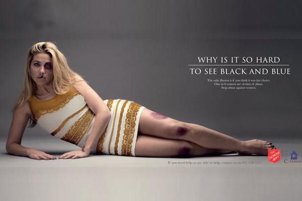 Die britische Heilsarmee nutzt das aktuelle "Dressgate", um gegen häusliche Gewalt ein Zeichen zu setzen. Zu sehen ist ein Model, das mit starken Blutergüssen und Schrammen in jenem Kleid steckt, das Zentrum heftiger Online-Diskussionen ist.
