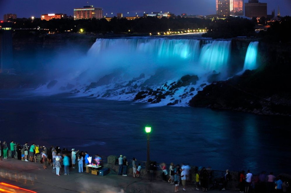 Laut den Berichten örtlicher Medien vom Montag wurde die Touristenattraktion an der Grenze zwischen Kanada und den USA passend zum Geschlecht des ersten Kindes von Prinz William und Herzogin Kate illuminiert. Auch der 553 Meter hohe CN-Turm in Toronto, der kanadischen Wirtschaftsmetropole, leuchtete nach Angaben eines Sprechers aus diesem Anlass blau.