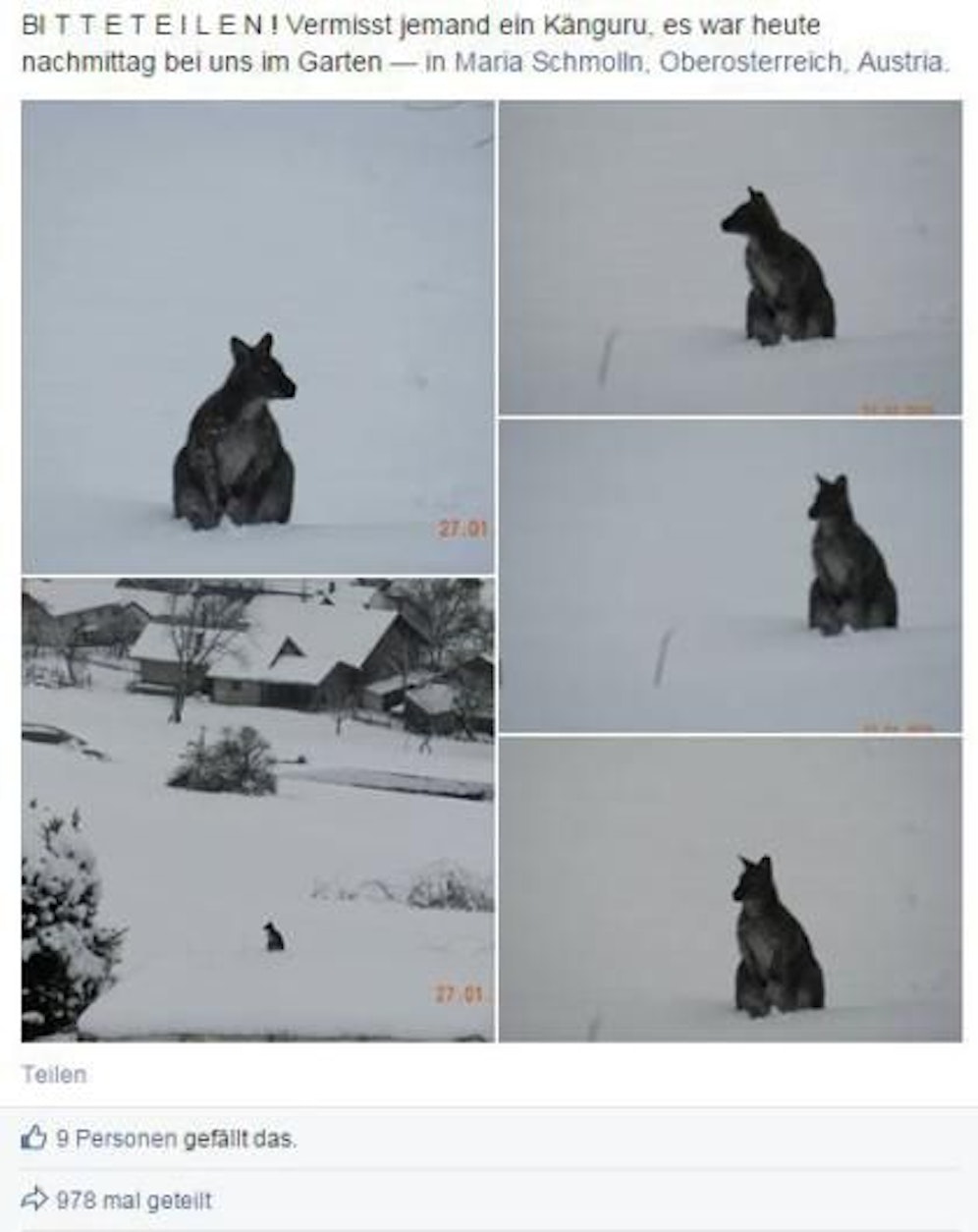 Eine Bürokauffrau aus dem oberösterreichsichen Maria Schmolln in Braunau war verwundert: "Wie kam nur diese Känguru in meinen Garten?". Am Dienstagnachmittag saß das Tier bei starkem Schneegestöber plötzlich auf ihrem Grundstück. Daraufhin entschloss sie sich, sich an die Facebook-Gemeinde zu wenden.