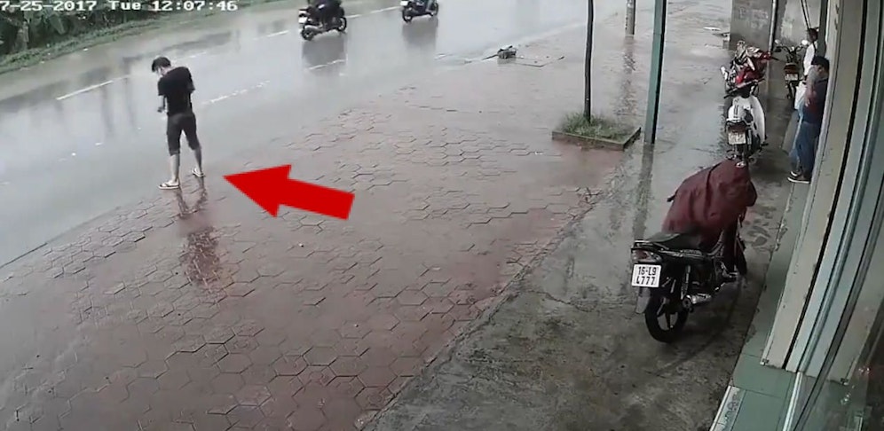 Ein Motorradfahrer aus Vietnam musste mal ganz dringend Wasser lassen. Also stellte er sich einfach spontan an den Straßenrand und entledigte sich erstmal.