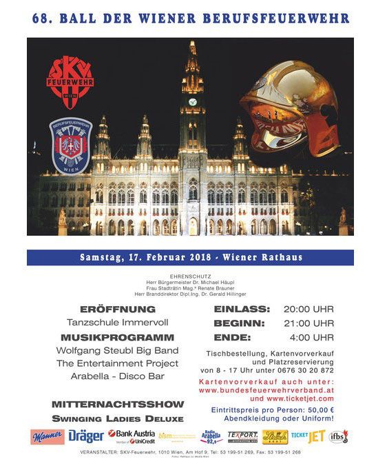 Am Samstag den 17. Februar 2018 findet im Wiener Rathaus unter dem Ehrenschutz von Bürgermeister Dr. Michael Häupel, Stadträtin Mag.a Renate Brauner und Branddirektor DI Dr. Gerald Hillinger der 68. Ball der Wiener Berufsfeuerwehr statt.