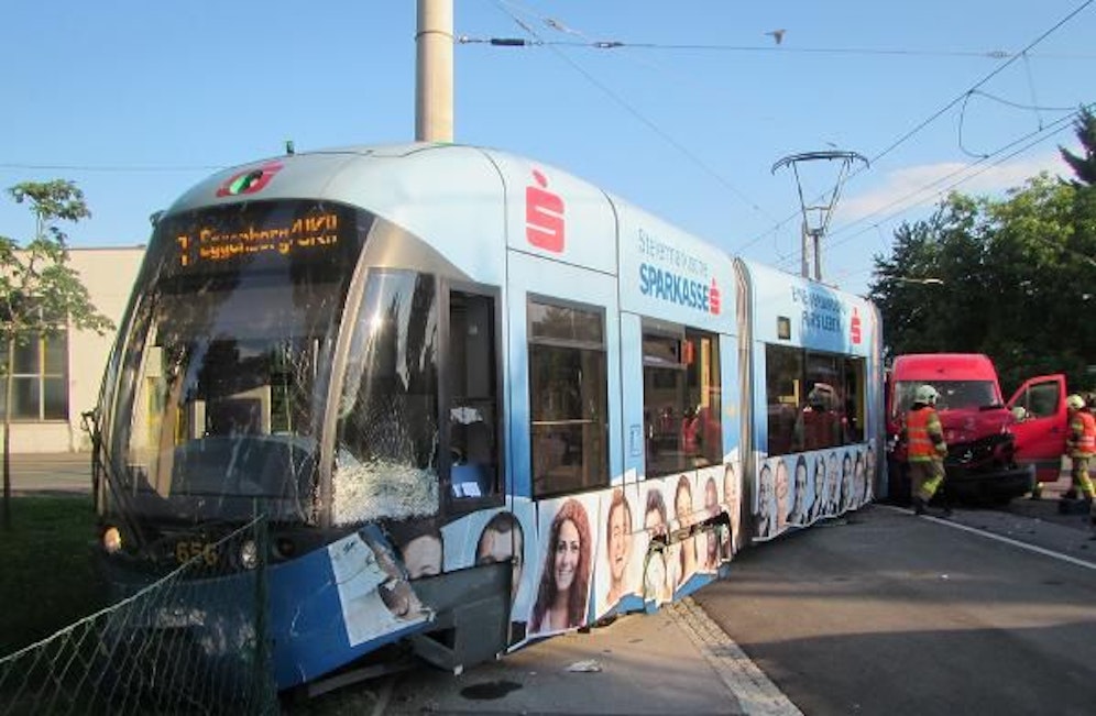 Laut Augenzeugen nahm der 40-jährige Fahrer des Kleintransporters der Straßenbahngarnitur der Linie 1 auf der Asperngasse in Graz-Eggenberg den Vorrang. Dann krachten die beiden Fahrzeuge an der Kreuzung mit der Daungasse ungebremst ineinander.