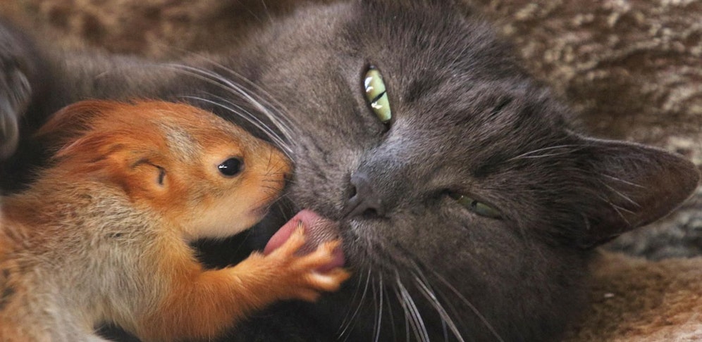 Mitarbeiter berichten, dass die kleinen Eichhörnchen anfangs noch ordentlich Angst vor der grauen Katze mit den stechenden, gelben Augen hatten.