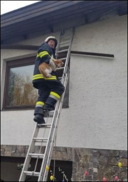 Mittels Leiter befreite ein Floriani die Samtpfote und trug sie nach unten. Das Tier hatte offenbar noch nicht genug Kletterabenteuer für einen Tag gehabt und machte sich die Schulter ihres Retters zur nächsten Aufgabe – mit Erfolg. (min)