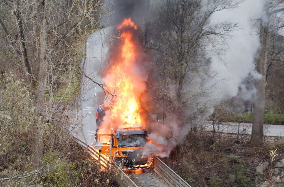 Der Lenker sah beim Einsatz am Radweg plötzlich im Rückspiegel Flammen aus der Kehrmaschine schießen. Sofort stellte er die Maschine ab und sprang aus dem Fahrzeug.