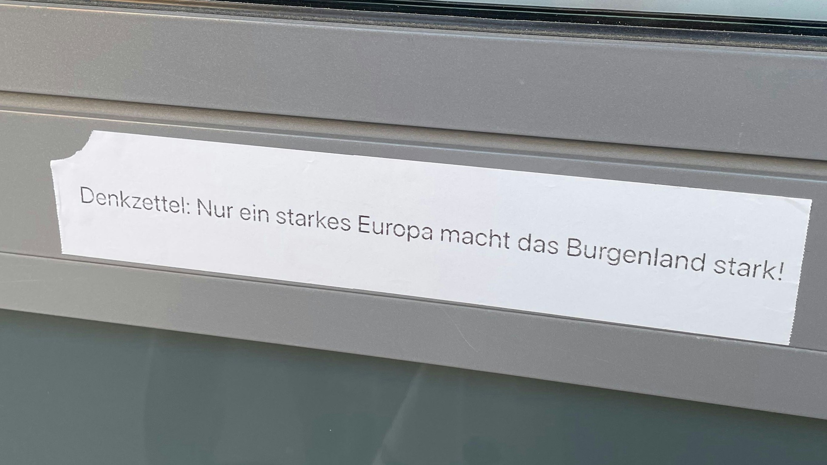 Keinen Spaß sehen die Neos aber, wenn es um die EU geht, weshalb die Pinken am Dienstag einen Denkzettel mit der Aufschrift "Nur ein starkes Europa macht das Burgenland stark" und eine EU-Fahne an die Parteizentralen von SPÖ, ÖVP und FPÖ verteilten.