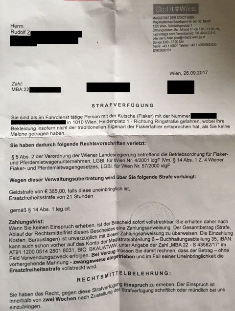 "Ich bin über den Heldenplatz gefahren und habe kurz meine Melone runtergegeben. Es hatte 31 Grad", rechtfertigt sich Rudolf Z. "Ich fahre seit über 20 Jahren Fiaker und habe normalerweise immer meinen Hut auf." Kurios: "Bei 35 Grad muss ich mit meinen Pferden nach Hause fahren, aber bei 31 Grad darf ich meine Melone nicht abnehmen." Rudolf Z. ist nicht der Einzige, der wegen einer fehlenden Melone abgestraft wurde. "Mir sind drei bis vier weitere Fälle bekannt. Ein Kollege soll 140 Euro Strafe zahlen. Bei mir ist es mehr, weil ich mit Fahrgästen unterwegs war."