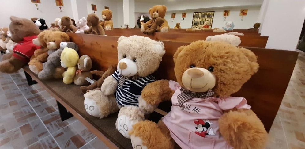 Herzerwärmende Aktion am Sonntag in der Kirche St.-Johannes-der-Täufer in der Margaretenstraße 141 (Wien-Margareten): Besucher nahmen flauschige Teddybären in die Messe mit, diese blieben nach dem Gottesdienst in den Bänken sitzen und wurden von Helfern der Pfarre eingesammelt.