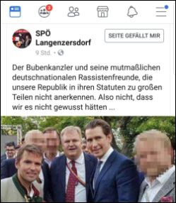 Im Juli trafen sich katholische Studentenverbindungen in Wien, auch Bundeskanzler Sebastian Kurz (VP) schaute einen Sprung vorbei und posierte für das eine oder andere Foto. Eines dieser Fotos veröffentlichte die SPÖ Langenzersdorf später auf Facebook mit dem Kommentar: "Der Bubenkanzler und seine mutmaßlichen deutschnationalen Rassistenfreunde, die unsere Republik in ihren Statuten zu großen Teilen nicht anerkennen."