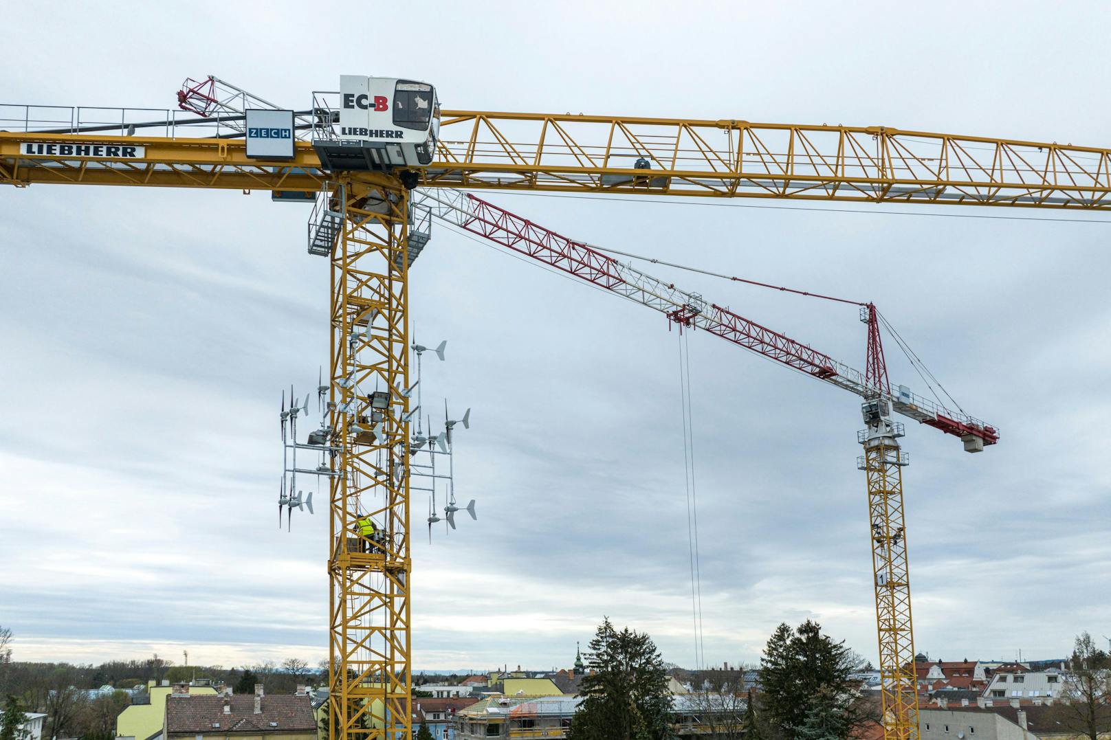 Montiert wurden die 16 Mikrowindturbinen mit einem Durchmesser von je 1,7 Meter in 30 Meter Höhe auf einem Baukran. Die Turbinen nutzen den Wind und erzeugen damit Strom, der direkt für den Baustellenbetrieb verwendet wird. Der Kran und auch das Baubüro versorgen sich somit während der Bauarbeiten zu einem Gutteil selbst mit Energie.
