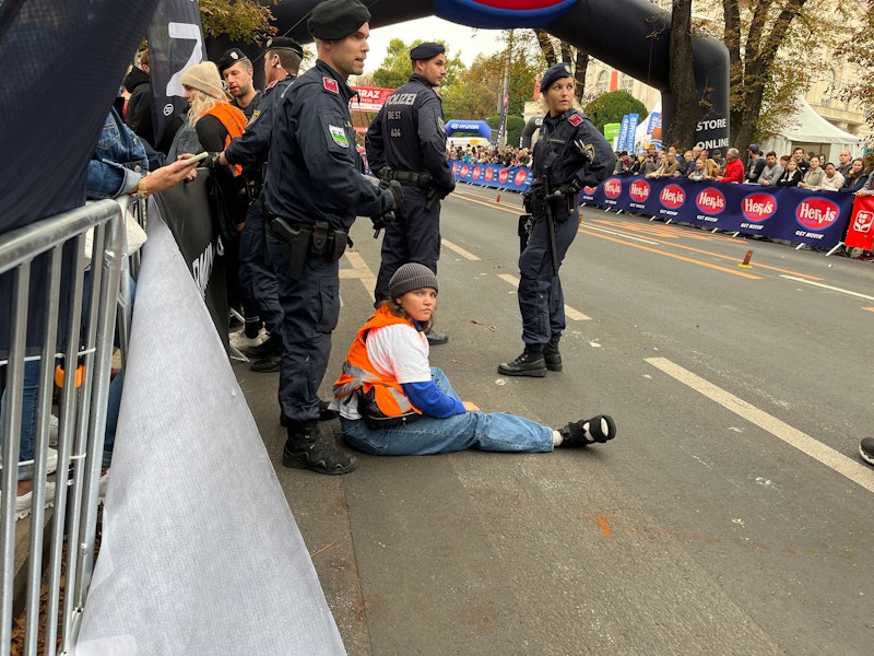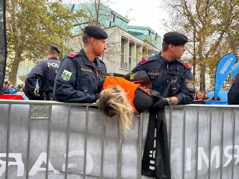 Kurz vor dem zweiten Startblock unterbrach die "Letzte Generation" den Graz-Marathon, "weil nur noch unignorierbare Proteste diese Regierung bewegen können, ihre Versprechen, ihre Ziele, geltende Verträge, Gesetze und die Verfassung einzuhalten", wie es Sprecherin Marina Hagen-Canaval (27) formulierte: "Wir stören nur sehr ungern Sport und Vergnügen, es ist jedoch angesichts der gravierenden gesundheitlichen Gefahren der Klimazerstörung notwendig."