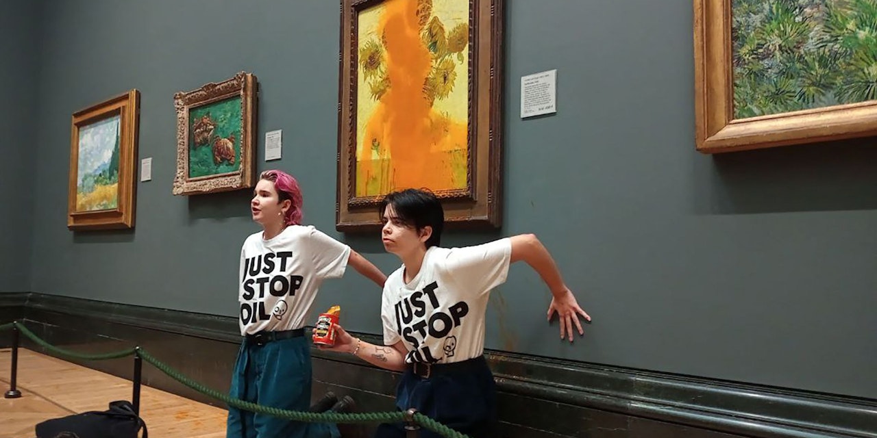 Wie Videos und Bilder auf Twitter zeigen, haben zwei Aktivisten von "Just Stop Oil" am Freitagmittag die National Gallery in London betreten. Mit im Gepäck hatten sie zwei Dosen Tomatensuppe, welche sie auf das Gemälde "Sonnenblumen" von Vincent van Gogh warfen. Im Anschluss klebten auch sie sich an der Wand neben dem Werk fest.