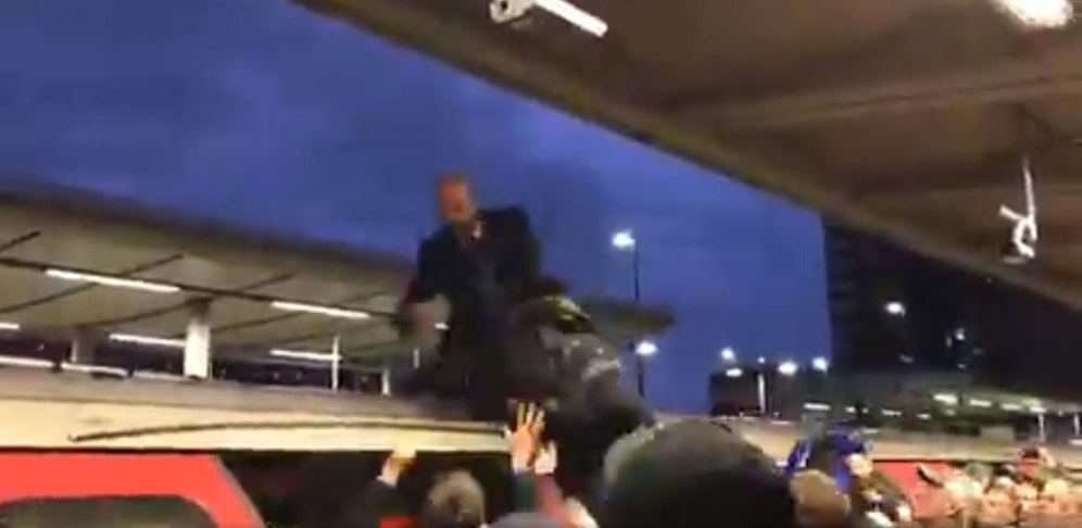 Die Pendler hatten aber wohl nur wenig Verständnis für die Aktion und begannen zunächst die Aktivisten verbal zu beleidigen. Danach brannten den Londonern die Sicherungen durch: Zunächst bewarfen sie die zwei mit Essen, dann sprang ein verärgerter Passagier hoch und zerrte einen der Blockierer runter. Die Meute zeigte nur wenig Gnade und prügelte wie wild auf den Mann ein. Sicherheitspersonal musste einschreiten, um die Situation halbwegs zu beruhigen.