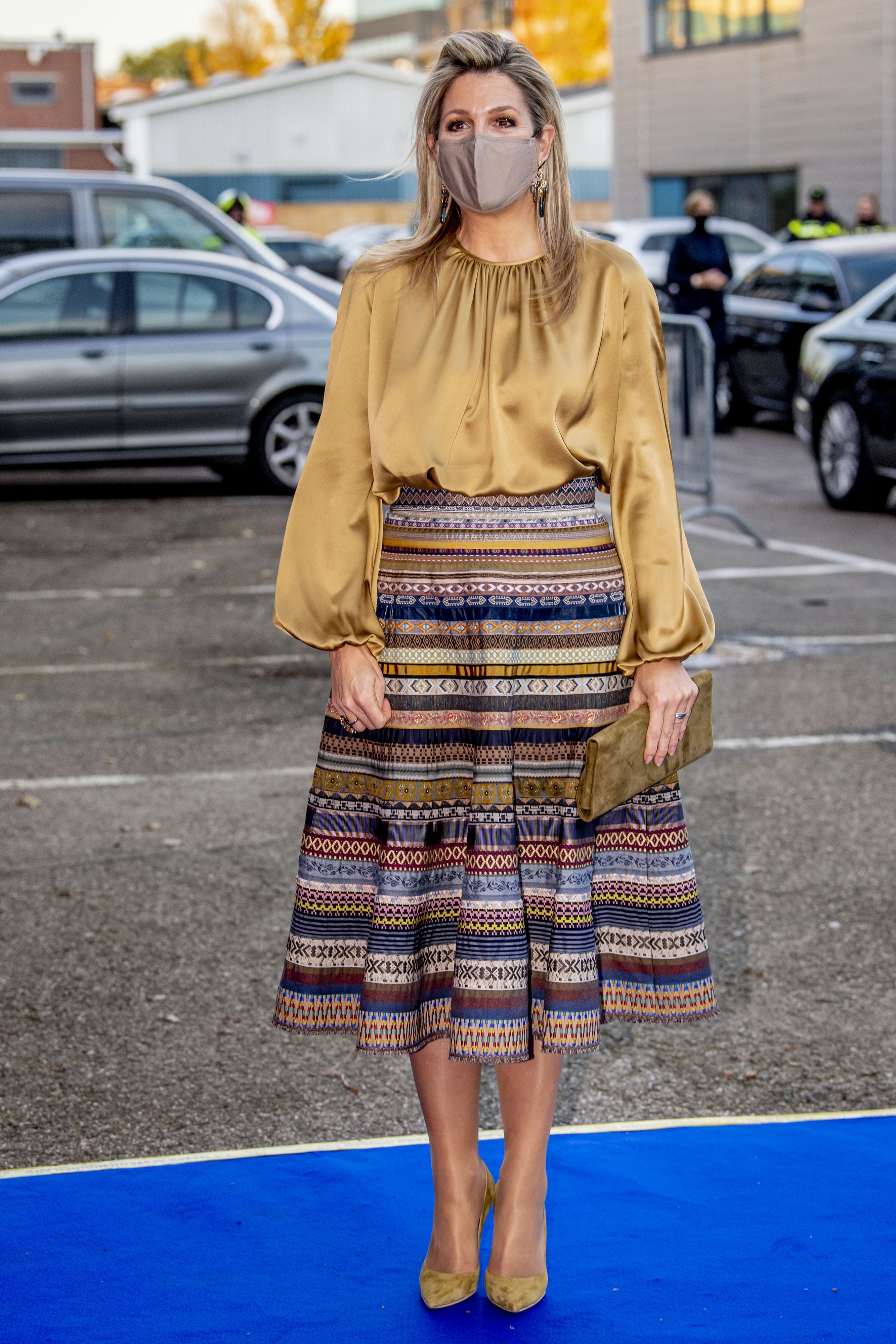 Königin Maxima kombinierte das musterreiche Stück mit einer goldfarbenen Seidenbluse, Rauleder-Pumps in Camel sowie einer Clutch in derselben Farbe.