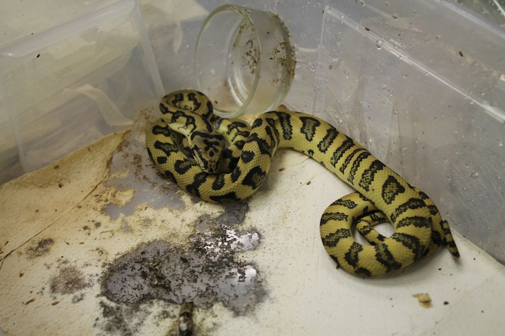 Beim Eintreffen der Tierrettung am Dienstag befanden sich die sehr jungen Pythons, schätzungsweise einige Monate alt, bereits in leblosem Zustand. Jede Hilfe kam zu spät.