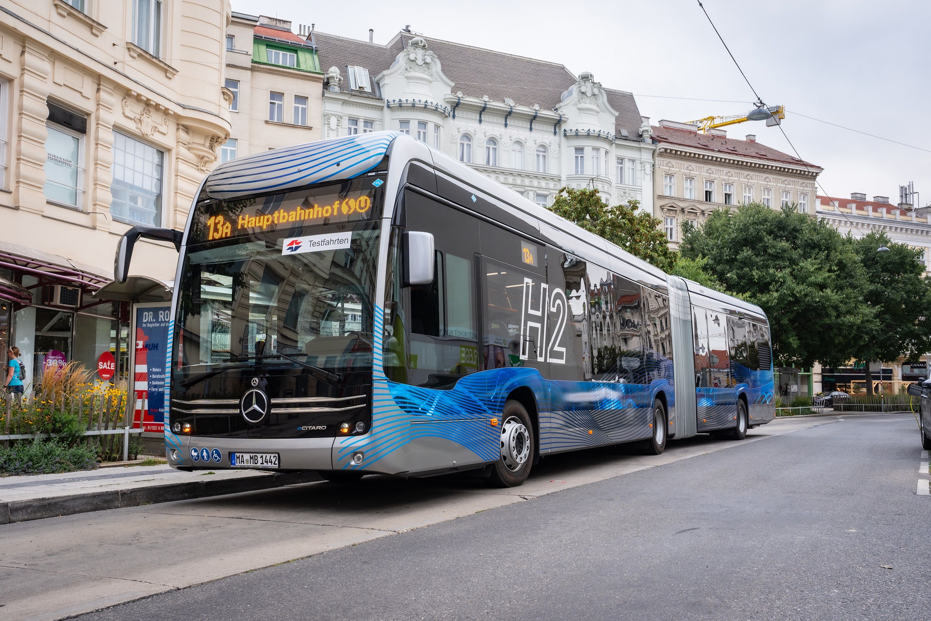 In den nächsten Tagen testen die Wiener Linien den Batterie-Wasserstoff-Gelenkbus von Mercedes-Benz. Der Bus im Test ist ein sogenannter Range Extender. Das heißt, das Fahrzeug wird von einem Elektromotor mit Batterie angetrieben, während eine Wasserstoff-Brennstoffzelle während der Fahrt zusätzlichen Strom erzeugt. Diese Kombi ermöglicht größere Reichweiten als bei herkömmlichen E-Bussen.