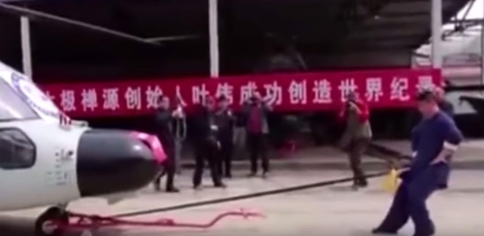 Der Mann aus China scheint gerne die Grenzen seiner Potenz auszutesten. Er hatte schon mehrere Male Autos mit seinem gezogen. Nun versuchte er sich an einem Militär-Helikopter.
