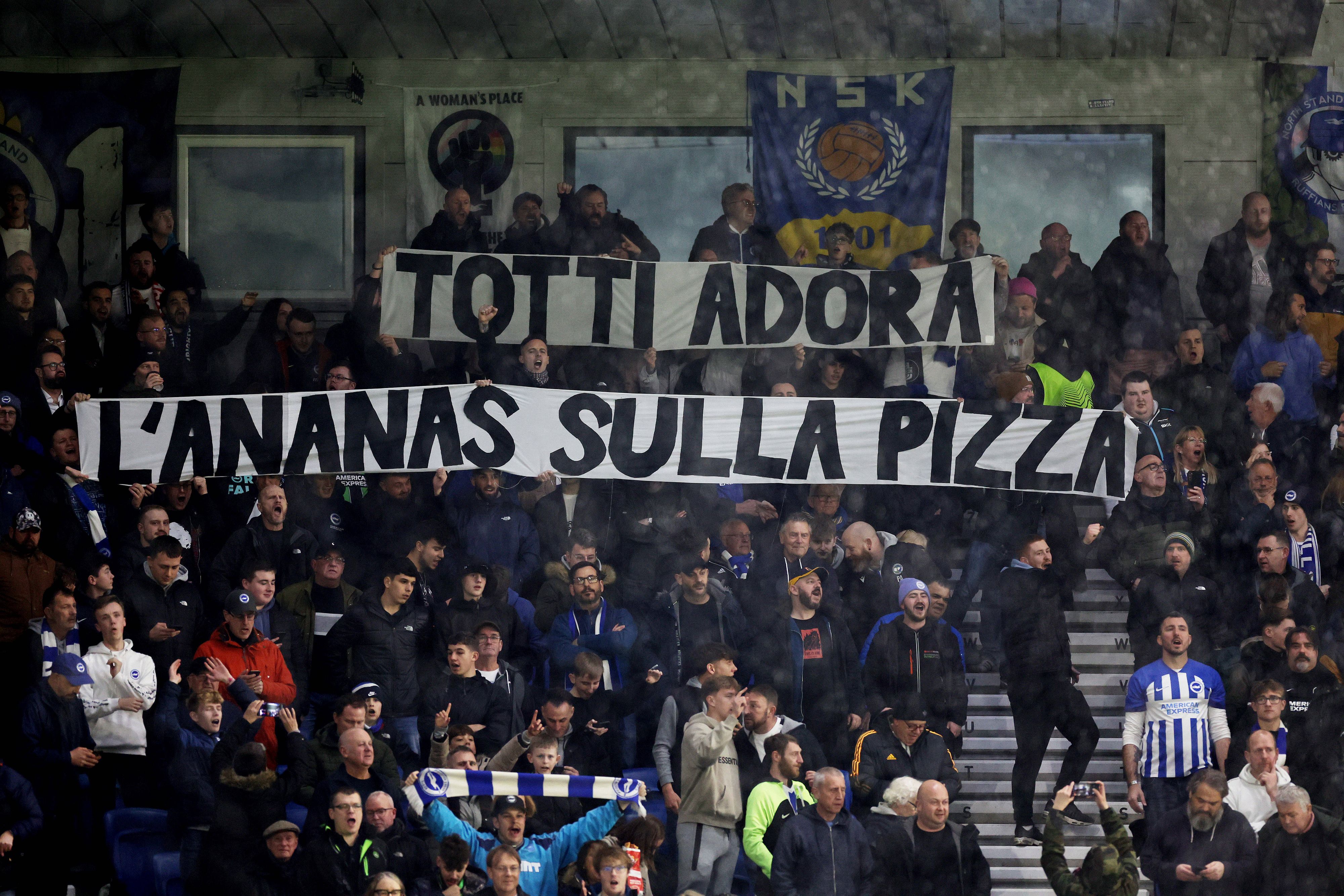 "Totti mag Ananas auf Pizza", stand in großen Lettern auf der Tribüne. In Italien gilt Pizza Hawaii als "Verbrechen" und ist in fast jeder Pizzeria von der Speisekarte verbannt.